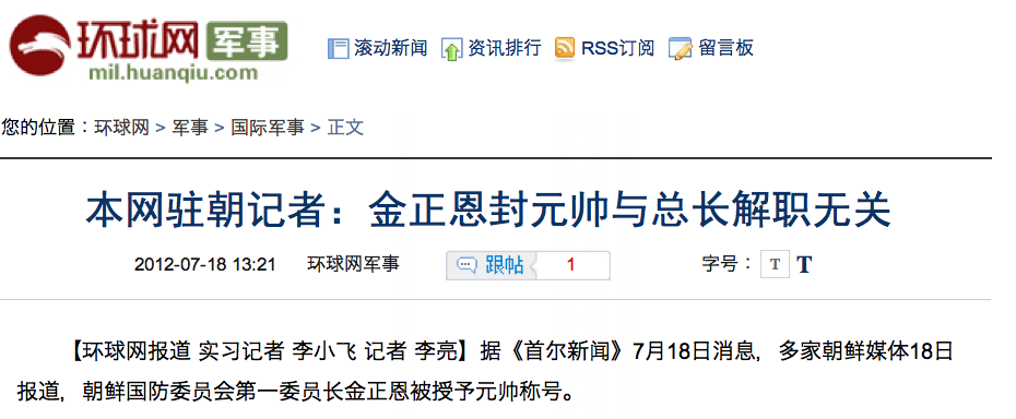 On July 18, Zhou Yiran, who is more or less the orthodox dean of Chinese North Korean correspondents and seems to be based in Pyongyang for the Huanqiu Shibao, went out on a limb with some analysisin the absence of hard information: Kim Jong Un’s ascention to the title of “Marshal” should be considered wholly normal in the North Korean context and shouldn’t be seen as in any way linked to the purge of Ri Yong-ho.