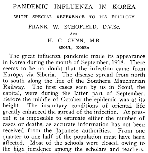 | ↑10 | Frank W. Schofield & H.C. Cynn, “Pandemic Influenza in Korea: With Special Reference to its Etiology,” Journal of the American Medical Association 72, no. 14 (1919): 981-983. |